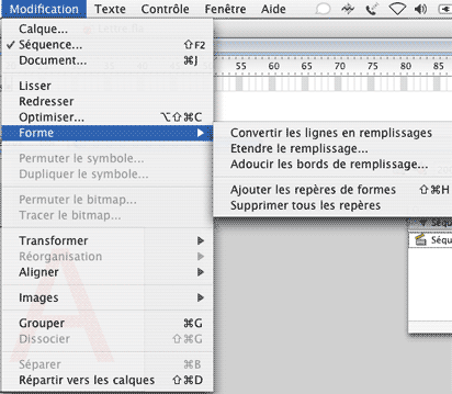 On ajoute autant de points que nécessaire. Au delà le 5 ou 6 points de repères, il faut penser à réaliser son animation en image par image, car l'interpolation de forme n'est peut être pas posssible. On peut supprimer un ou tous les repères en passant par le menu ou en cliquant droit sur un point de repère (de la première image toujours). Si l'animation continue, faire de même pour chaque nouvelle interpolation de forme qui pose problème.
