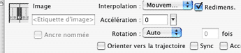 L'image ci-dessus montre les options de la fenêtre de propriété. L'accélération permet d'accélérer le mouvement ou le ralentir, au début ou à la fin de l'interpolation. La rotation permet de faire tourner un objet sur lui-même un certain nombre de fois et dans un sens ou l'autre. On choisit le nombre de rotation dans la zone de texte qui suit. La case "orienter vers la trajectoire" est une option du guide de mouvement.