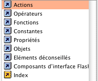 Les dossiers d'actions s'affichent à droite dans la fenêtre action. Ces dossiers se développent lorsque l'on clique dessus. et présentent des sous dossiers et dans ces sous dossiers se trouvent des actions. En mode normal, lorsque l'on double clique sur une action, "stop" par exemple, le code stop(); s'écrit dans la partie droite de la fenêtre en bleu. Ces dossiers permettent donc d'aider à rédiger les actions script.